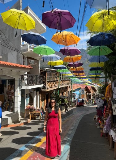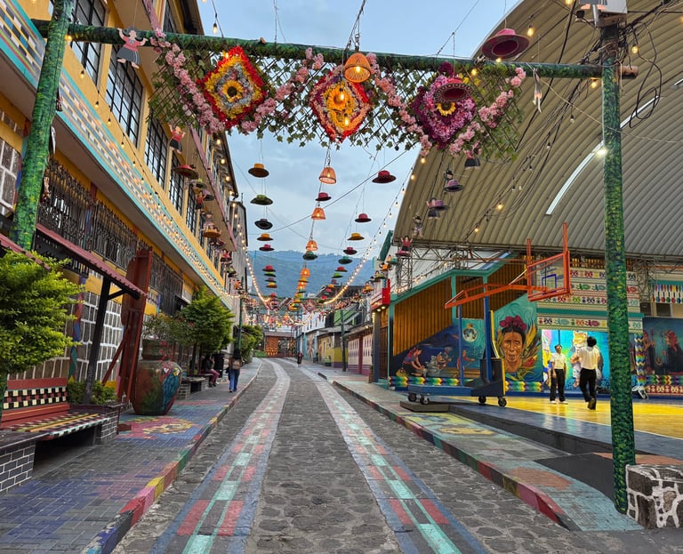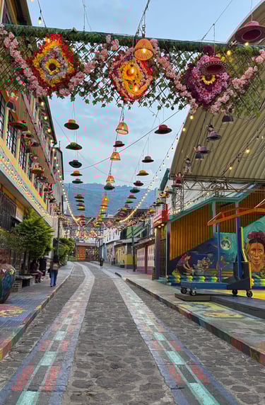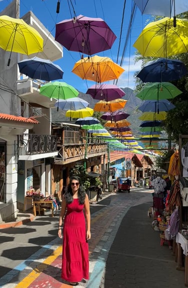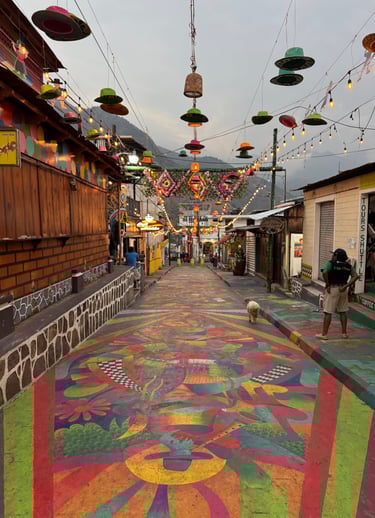 San Juan La Laguna is a vibrant and colourful town, and you simply cannot miss wandering through its rainbow-painted streets. If you arrive by boat, you'll step right onto La Calle de las Sombrillas ("The Street of Umbrellas"). Walk a little further, and you'll find La Calle de los Sombreros, a lively street filled with beautiful street art and colourful hanging hats.